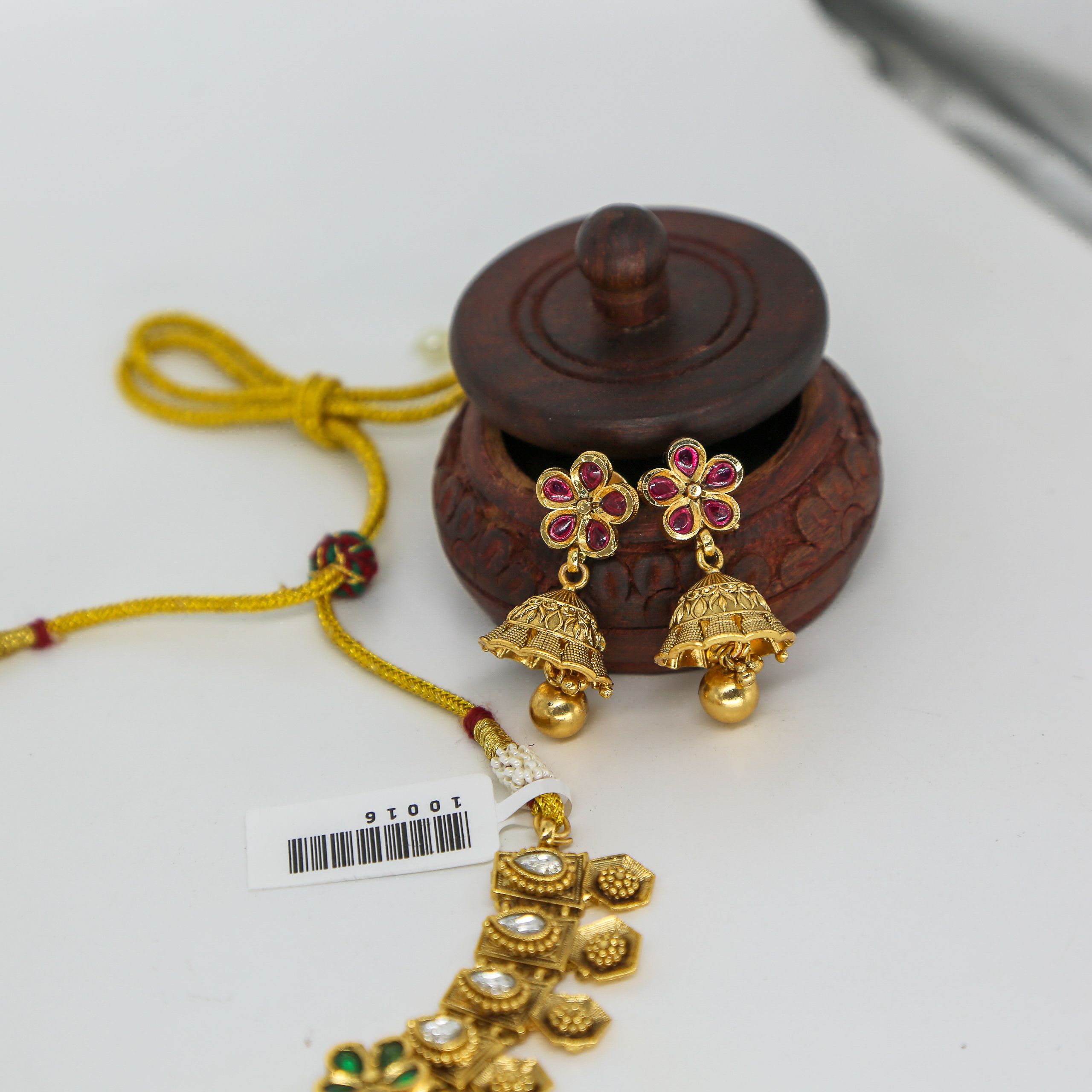 Be the first to review “Antique Gold Kundan Necklace with Floral Motifs and Jhumka Earrings”