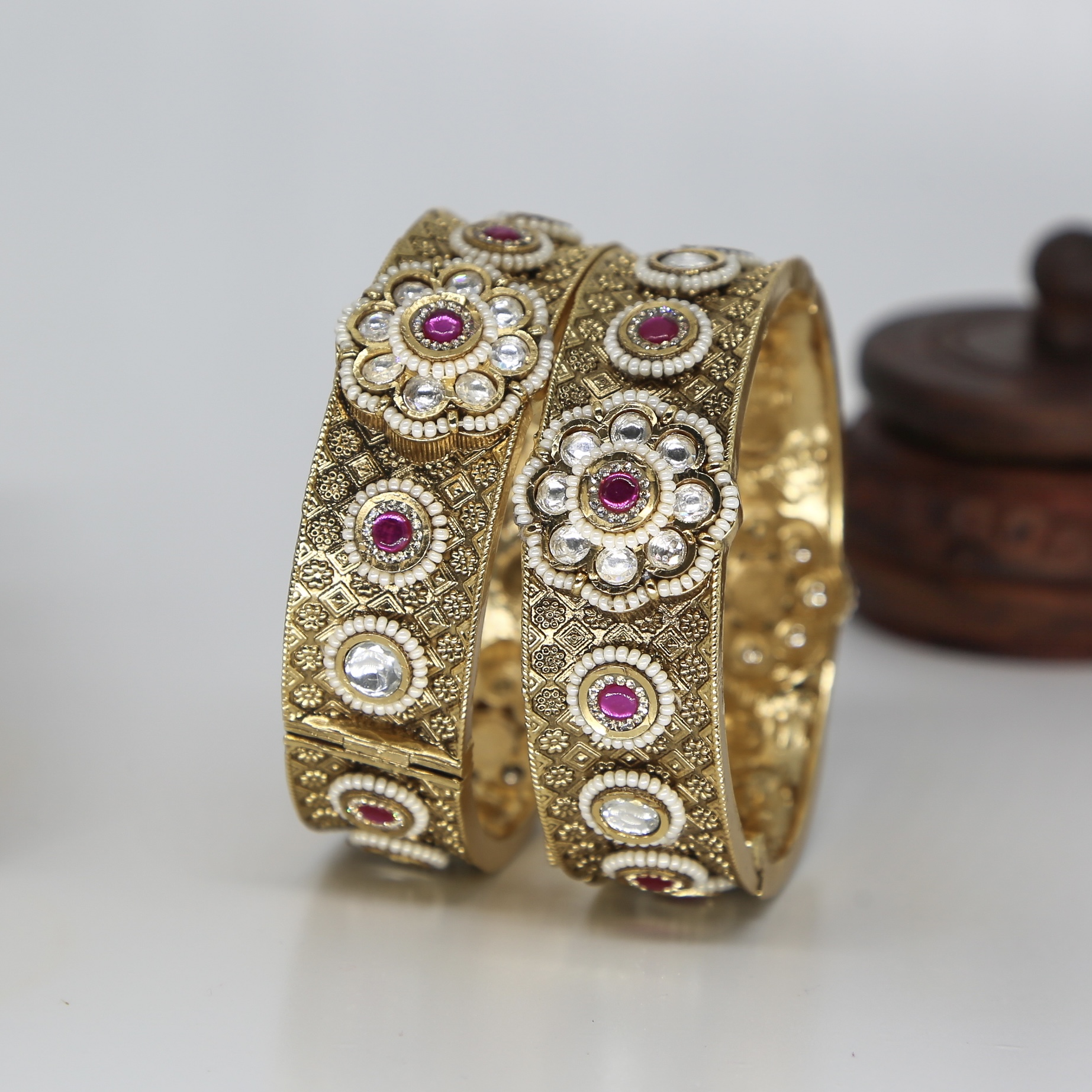 Beautiful broad stone gold finish bangle set is a timeless piece that will provide you with years of beautiful wear. The metal-brass alloy with gold plating is made to last. Beautiful broad stone gold finish bangle set is show-stopping and comes in traditional Indian design with gold plating and handwork. Buy Beautiful broad stone gold finish bangle set