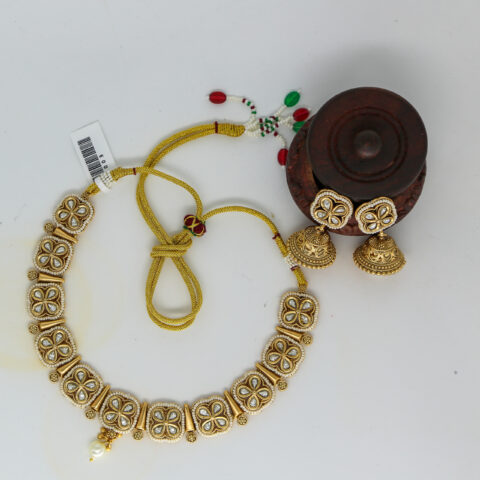 Stunning gold plated stone necklace set with pearl drop earring is a show-stopping, traditional Indian necklace set with gold plating and handwork.