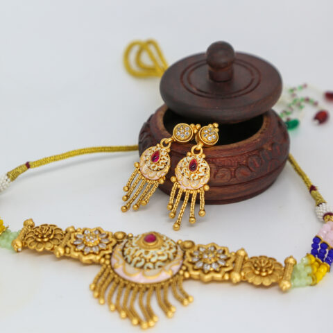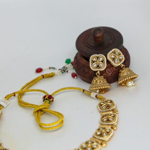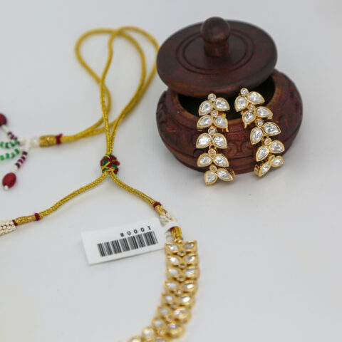 Stunning gold plated stone necklace set with pearl drop earring is a show-stopping, traditional Indian necklace set with gold plating and handwork.